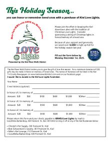 2025 Love Lights Donation Form PDF This Holiday Season you can honor or remember loved ones with a purchase of Kiel Love Lights. Fill out the form and return it by Dec 1, 2025 Download "Love Lights Form.pdf"